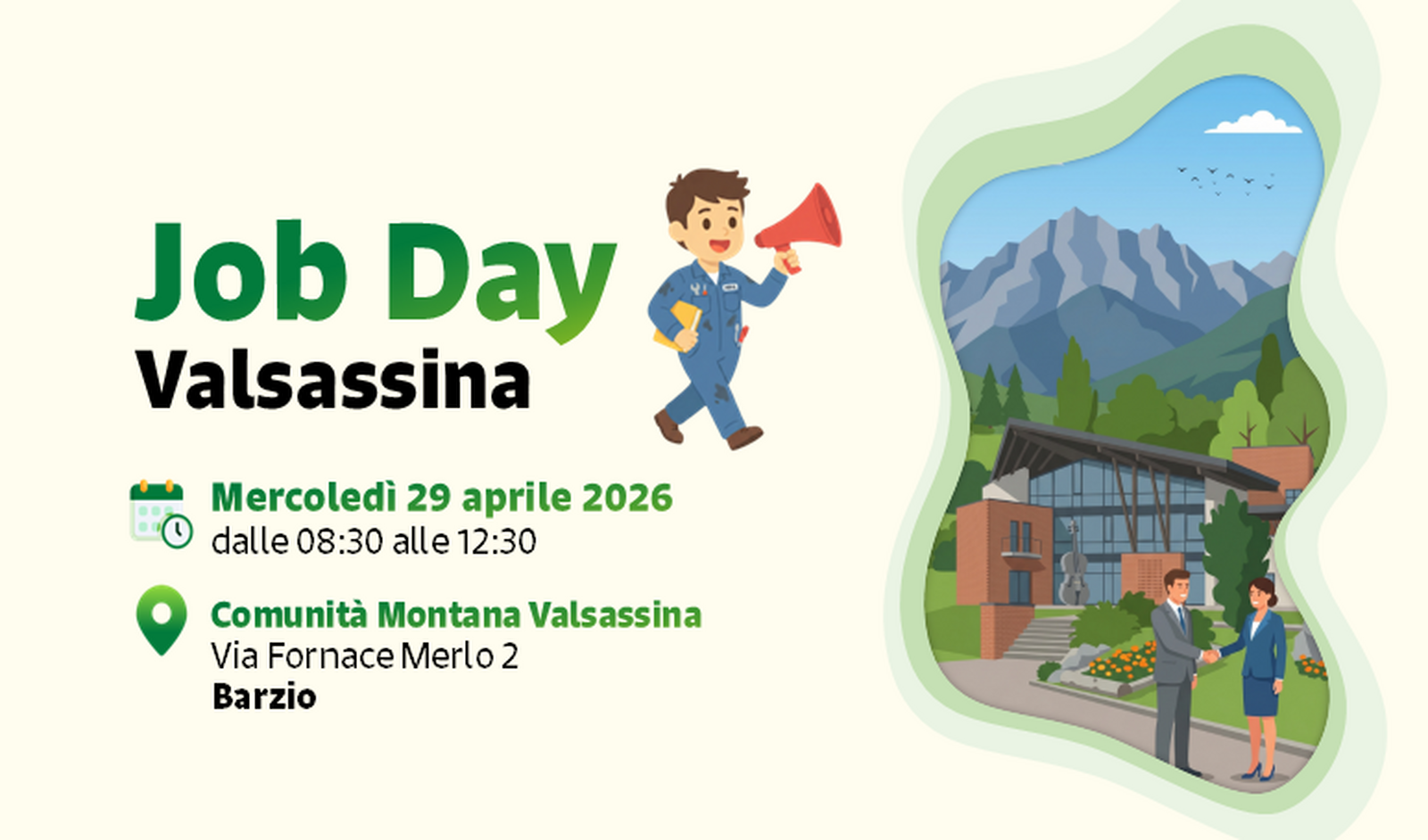 Mercoledì 29 aprile dalle 08:30 alle 12:30 presso la Comunità Montana Valsassina a Barzio torna il Job Day Valsassina, l’iniziativa finalizzata a favorire l’incontro tra le realtà del territorio e le persone disoccupate, in cerca di una nuova opportunità lavorativa o interessate a riattivarsi nel mondo del lavoro.