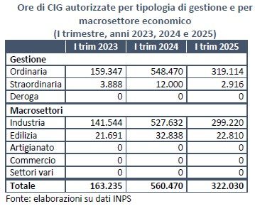 Malgrado questa dinamica decrescente, il numero di ore autorizzate nel primo trimestre 2025 rimane comunque quasi doppio rispetto a quanto rilevato nello stesso periodo del 2023, in cui si registravano poco più di 163.000 ore autorizzate. La quasi totalità delle ore autorizzate nel primo trimestre 2025 riguarda la CIG ordinaria: si tratta di circa 319.000 ore, che corrispondono al 99,1% delle autorizzazioni complessive.