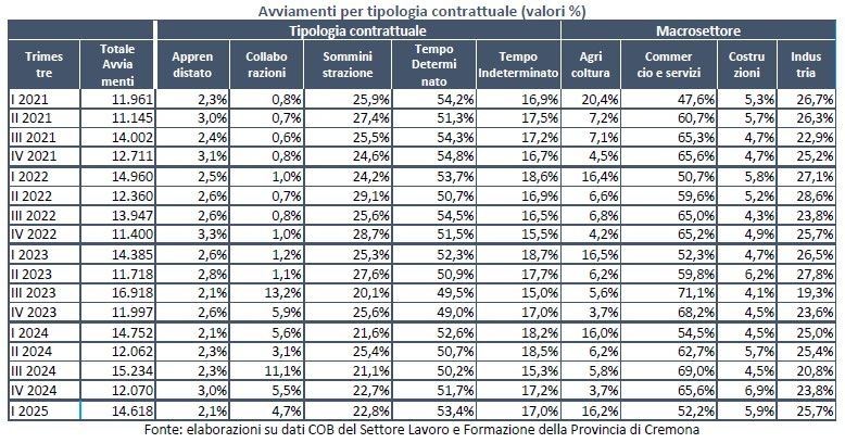 Nel periodo gennaio-marzo del 2025, in provincia di Cremona si sono registrati 14.618 avviamenti (ovvero nuove attivazioni di rapporti di lavoro). Tale volume rappresenta una lieve contrazione, quantificabile nello 0,9%, rispetto al medesimo periodo dell’anno precedente, ad indicare una contenuta contrazione su base tendenziale.