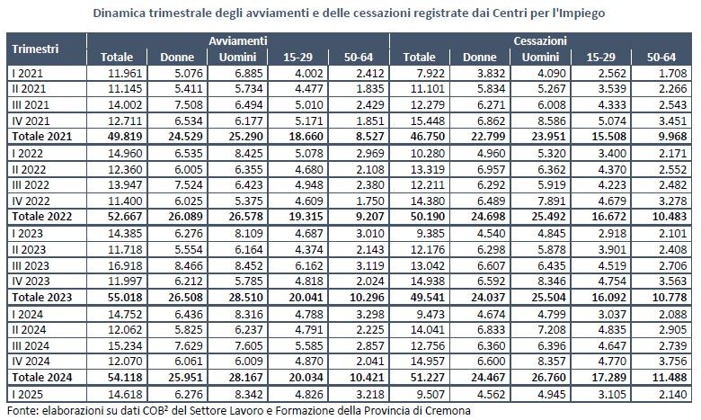 Una configurazione analoga si riscontra anche nell’analisi delle cessazioni dei rapporti di lavoro: nel primo trimestre del 2025, infatti, il 41,6% delle interruzioni contrattuali risulta riferibile sempre alla circoscrizione del Centro per l’Impiego di Crema.