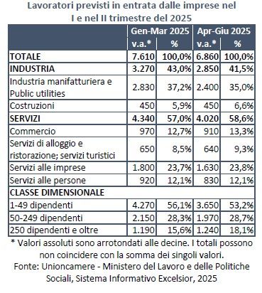 Tale valore risulta in diminuzione del 9,7% rispetto a quanto osservato nel primo trimestre del medesimo anno. Inoltre, le previsioni di assunzione riferite al secondo trimestre del 2025 risultano inferiori rispetto a quelle rilevate nello stesso periodo dell’anno precedente, quando i flussi di entrata previsti ammontavano a 7.280 unità.