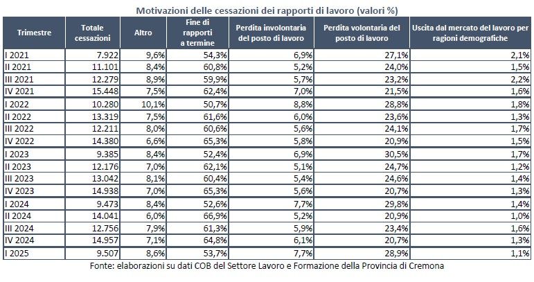 Causa principale delle cessazioni è la fine di rapporti a termine ma le dimissioni volontarie sono comunque rilevanti