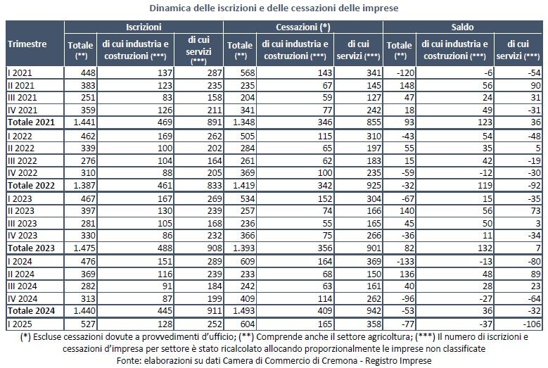 L’analisi degli indicatori relativi alla demografia d’impresa nella provincia di Cremona per il primo trimestre del 2025 mette in evidenza un saldo negativo tra iscrizioni e cessazioni non d’ufficio, pari a -77 imprese. Pur confermandosi un valore che riflette una contrazione della base imprenditoriale, la dimensione del saldo negativo risulta meno accentuata rispetto a quanto osservato nei trimestri precedenti: nel primo trimestre del 2024 si era registrato un decremento di -133 imprese, mentre nel quarto trimestre dello stesso anno il saldo era pari a -96 unità.