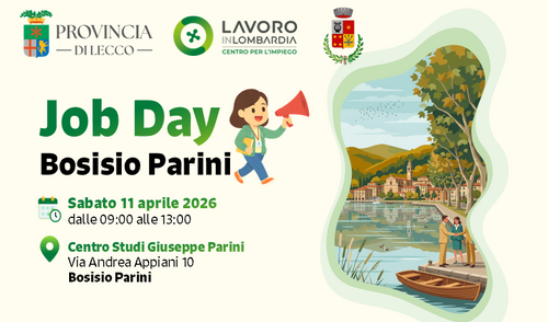 Sabato 11 aprile dalle 09:00 alle 13:00, al Centro Studi Pariniani di Bosisio Parini, si terrà il Job Day Bosisio Parini, iniziativa finalizzata a favorire l’incontro tra le realtà con sede nel territorio della Brianza e le persone disoccupate.