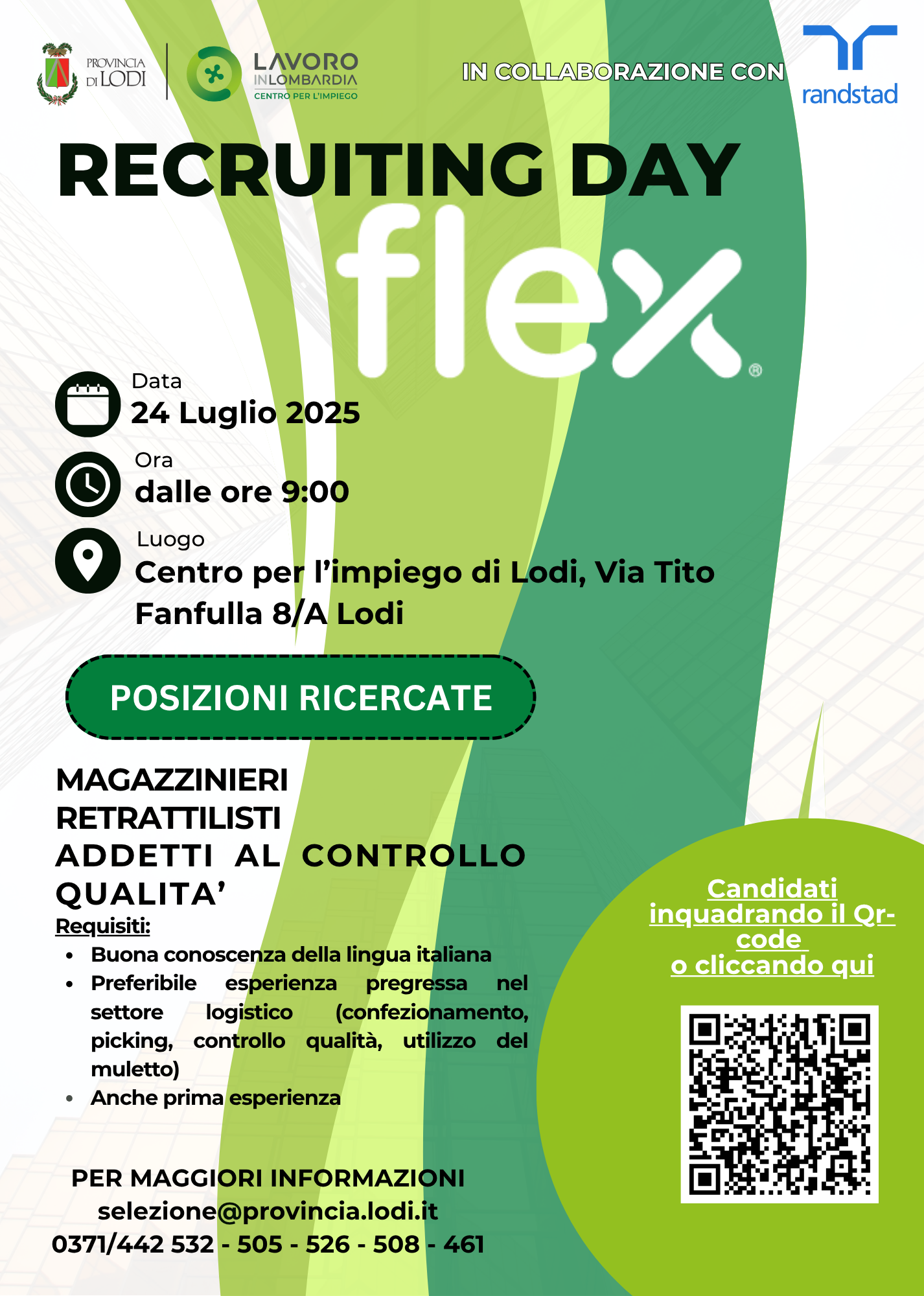 Vista l’ottima partecipazione registrata nella prima giornata, il Centro per l’Impiego della Provincia di Lodi, in collaborazione con Randstad, organizza una seconda data del Recruiting Day dedicato a Flextronics, per la ricerca di Magazzinieri Retrattilisti addetti al controllo qualità, che si terrà il 24 luglio 2025 presso la Sala dei Comuni della Provincia di Lodi.