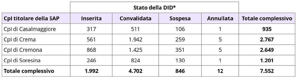 * Lo stato della DID è stato rilevato alla data del 08/01/2025. Il conteggio si riferisce alle DID rilasciate da utenti domiciliati in provincia di Cremona e da utenti non domiciliati in provincia ma la cui SAP è di competenza di uno dei CpI provinciali, sempre alla data del 08/01/2025.