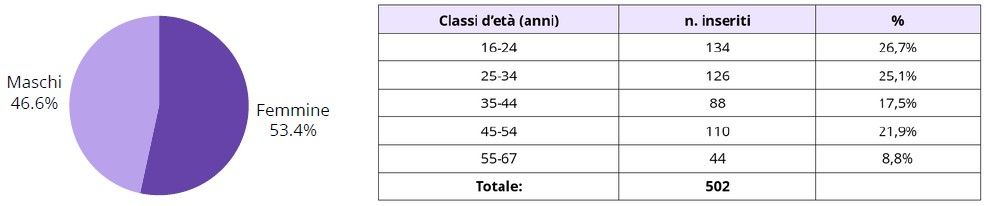 Le persone inserite sono prevalentemente di sesso femminile, con un’età media di 35,5 anni.